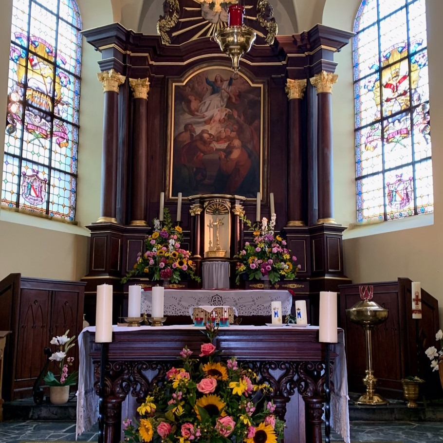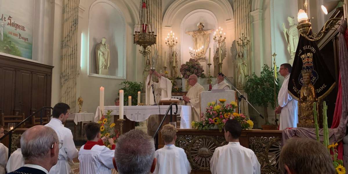 Parochianen uit Villers-Notre-Dame en Villers-Saint-Amand en omgeving, pelgrims en vrienden verzamelden zich eerst met Abbé Xavier Nys, pastoor van de Pastorale Eenheid, in de kerk van Villers-Saint-Amand om de Heilige Mis te vieren in het Frans en het Nederlands, met een vleugje Engels. Het Credo in het Latijn was een gelegenheid om de universaliteit van de Kerk en de verbondenheid van alle deelnemers tot uitdrukking te brengen.