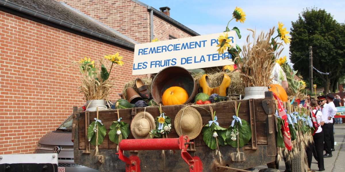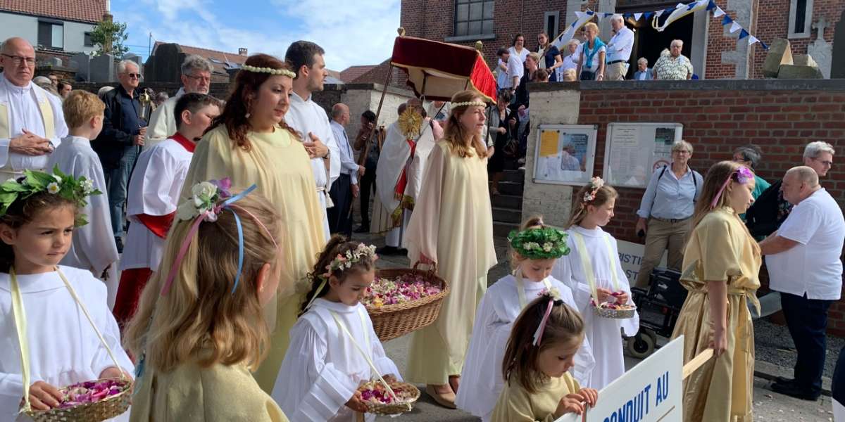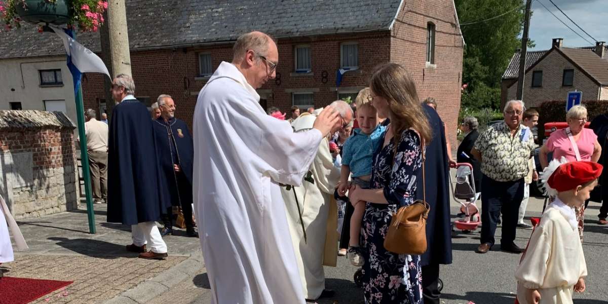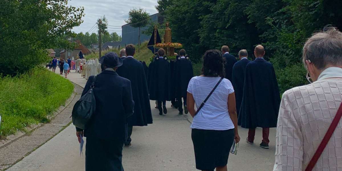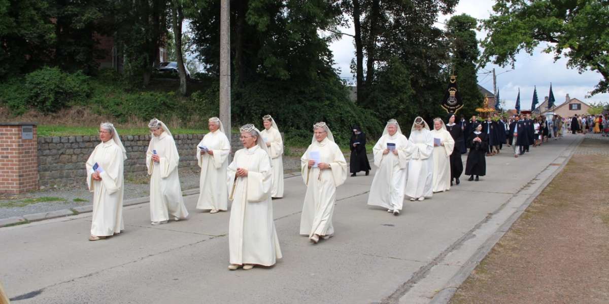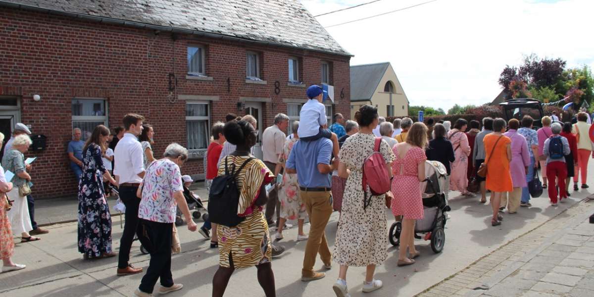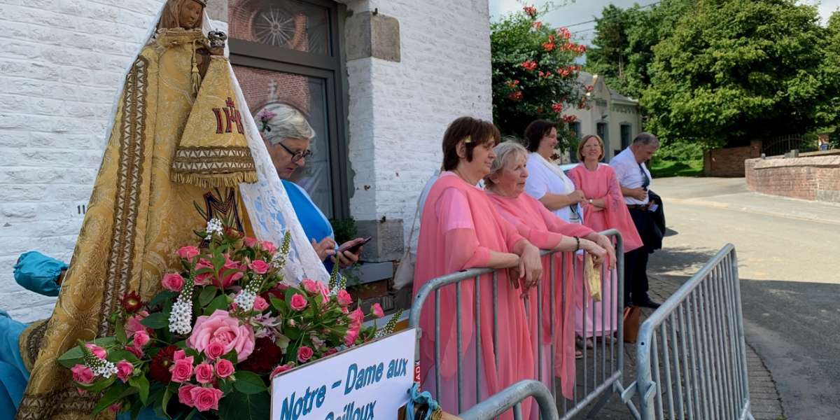 De processie begaf zich vervolgens naar het heiligdom van Villers-Notre-Dame, met een korte tussenstop bij het kapelletje van de H. Gerardus en de kapel van de molen. Eerst zien we de gebruikelijke groepen, de praalwagen om te danken voor de vruchten van de aarde, de fanfare " verenigde vrienden" uit Ellezelles", de Heilige Amandus en Onze-Lieve-Vrouw van de Rozenkrans. Daarna kwamen de gastgroepen, een delegatie uit Schotland die koningin Margaret vertegenwoordigde en haar relikwieën droeg, en een groep die de relikwieën van de heiligen Relinde en Harlinde droeg, wiens jubileum zojuist werd gevierd. Sinds 1388 wordt deze schat elke vijfentwintig jaar in processie van Aldeneik naar Maaseik gedragen. Klein maar fijn, Onze Lieve Vrouw van de kiezelstenen, die voor de gelegenheid haar kapel heeft verlaten, wordt met trots gedragen door een kleine delegatie uit Meslin l'Évêque. Een groep jonge pelgrims, net terug van de WJD, kwam samen om het kruis te dragen en de bijzondere dagen die ze in Lissabon doorbrachten opnieuw te beleven. Onze-Lieve-Vrouw van Villers, gedragen en omringd door de Pelgrims van Maria Zetel der Wijsheid, trok vervolgens door haar dorp, gevolgd door het Heilig Sacrament, voorafgegaan door een groep zusters van Het Werk in koormantel en de Gemeenschap Dienaressen van de Armen uit Jemappes.