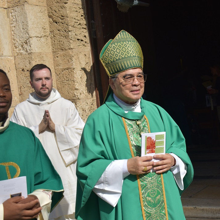 "Vooral in dit heilige en complexe land, waar het katholieke apostolaat met zoveel beperkingen en uitdagingen wordt geconfronteerd, vraag ik u te laten zien dat het essentiële in onze samenwerking aan de verlossing van Christus niet het "doen" is, maar het "zijn". Denk aan wat Sint-Paulus II schreef in zijn Apostolische Brief aan het begin van het tweede millennium, getiteld "Novo Millennio Ineunte": "Onze tijd is er een van voortdurende beweging, die vaak zo ver gaat dat het activisme gemakkelijk het risico loopt van "doen omwille van het doen". We moeten deze verleiding weerstaan en proberen te 'zijn' voor 'doen'" (NMI 15). Het eerste en meest kostbare werk blijft de persoonlijke heiliging en de aanbidding van God. Daarom nodig ik u uit om de praktijk van de eucharistische aanbidding, die u al dierbaar is, voort te zetten en vol te houden: door te knielen keren we terug naar het wezenlijke van ons leven."