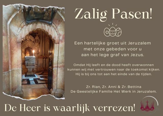 Na 49 jaar zijn deze woorden nog steeds actueel. Het door oorlog geteisterde Land snakt naar vrede en verlossing. Plaatsvervangend voor alle pelgrims die op dit moment wegblijven, wil onze gemeenschap voor u op deze Heilige plaatsen bidden. Zij sturen u hartelijke wensen voor Pasen.
