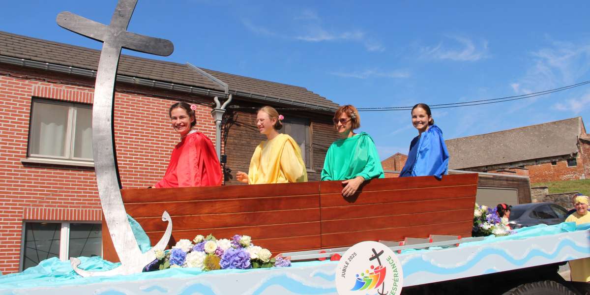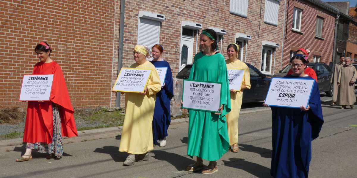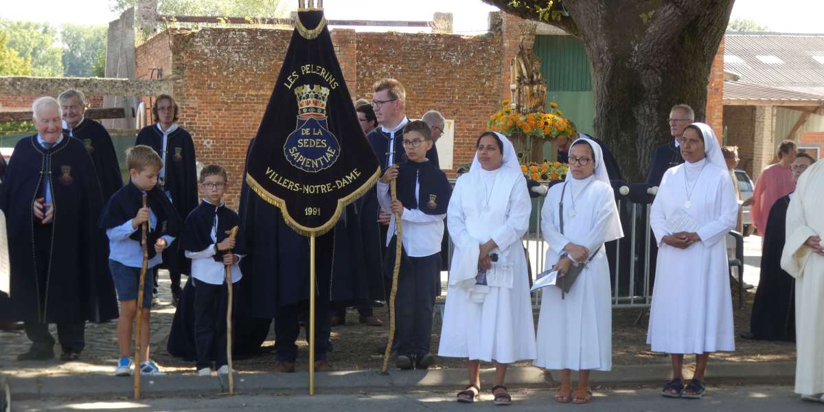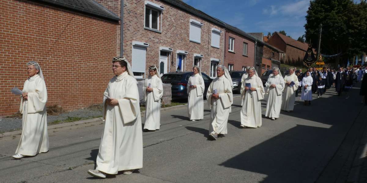 Daarna kwamen de zusters van Het Werk en van Onze-Lieve-Vrouw van Goede en Voortdurende Bijstand uit Ellezelles, gevolgd door Onze-Lieve-Vrouw van Villers, omringd en gedragen door de pelgrims van de Sedes Sapientiae: dames, heren, jongeren en kinderen.